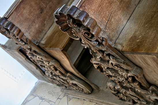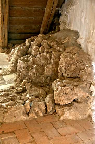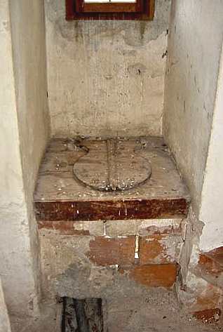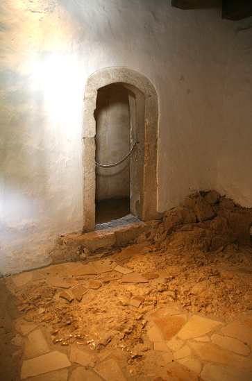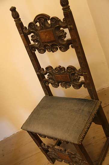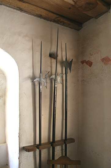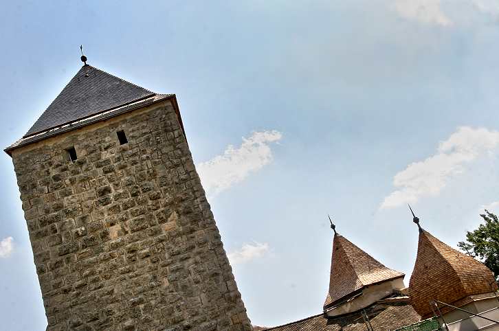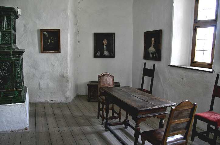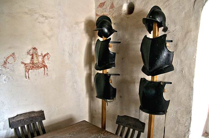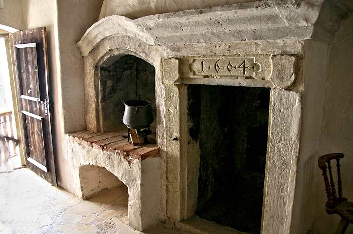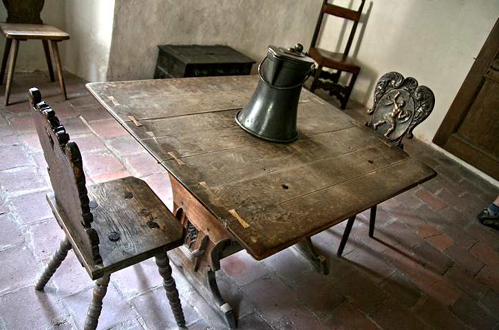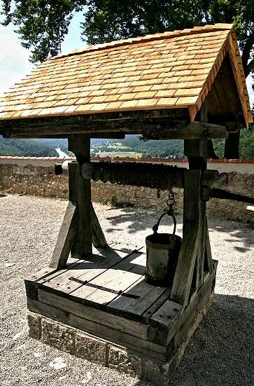 Freigeländer und von dort in die Burgküche. You enter the castle across a wooden bridge, which connects the rock with the castle to the mountain. Through the maindoor you reach the courtyard. The original outside wall has been reduced in it's height, so you can catch the terrific view into the Altmuehl Valley. On the right of the doorhall you get to a tower with a staircase. And be going up there, you enter the castel's kitchen |