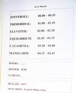 is the press statement from the promoter in German) Wir haben hier jetzt sehr kurzfristig zum Wochenende erst einen Bescheid der Ordnungsbehörde bekommen, der es uns unter anderem untersagt das von uns geplante Metal-Festival mit den Bands FINNTROLL & PRIMORDIAL & ELUVEITIE & EQUILIBRIUM & MANEGARM & CATAMENIA durchzuführen. Wir hätten in Folge dessen das Konzert absagen müssen. Wir haben jetzt die letzten einenhalb Tage Tag u. Nacht alles in Bewegung gesetzt ums zu versuchen wie wir die Schow - auf die auch wir uns schon lange freuen - überhaupt und noch möglichst gut retten können. In Absprache mit dem Tourveranstalter und den Bands haben wir jetzt beschlossen den Konzertbeginn von 18 auf 24:00 h zu verlegen, weil dann diese Feiertagseinschränkung nicht mehr gilt. Wir wissen, dass diese Nachricht so kurzfristig wahrscheinlich nicht mehr sehr viele erreichen wird - mailt, postet, smst, telephoniert dies doch bitte weiter! - aber wir haben uns sehr viel mühe gegeben die Lösung zu finden die für die meisten noch die Beste sein kann. Wir hatten nur die Alternative das Konzert ganz abzusagen oder eben nach hinten zu verschieben - was unserer Meinung nach die noch bessere Alternative ist. Hierbei nochmals unseren großen RESPEKT AN ALLE BETEILIGTEN BANDS und den Tourveranstalter Rock the Nation! - die dieser Lösung zugestimmt haben, u.a. weil diese dann ja bis früh in den Morgen spielen werden und morgen den Nächsten Gig in der Schweiz haben. Also nochmals zum Ablauf: --------------------------------------------------------------------- Ihr könnt Euch entscheiden, ob ihr die Show ab 24:00 h Uhr sehen wollt oder nicht. • Solltet Ihr unter 18 J. sein (dann dürft Ihr wegen dem Jugendschutz das Konzert leider nicht mehr besuchen außer Ihr kommt in Begleitung eines Erziehungsberechtigten oder mit einem entsprechend beauftragten siehe: Mindestalter für Konzerte, Partys etc....) oder unter diesen Umständen die Show nicht mehr sehen wollen oder können - könnt Ihr Eure Tickets an den VVK-Stellen, wo Ihr diese gekauft habt wieder umtauschen und Ihr bekommt dort Euer Geld zurück • Wenn Ihr die Show, die spätestens ab 24:00 h starten wird, anschauen wollt könnt Ihr gleich da bleiben (die Türen öffen wir so oder so ab 18:30 und haben auch ausgedehnte Außenbereiche/Biergärten) oder Ihr behält Euer Ticket und kommt halt bis zur Show wieder -------------------------------------------------------------- TIPP FÜR ALLE DIE IHR TICKET NICHT WAHRNEMEN KÖNNEN ODER WOLLEN: Nach dem die Show seit Wochen ausverkauft ist könnte es gut sein, dass Ihr Eurer Ticket gleich vor Ort an Leute verkaufen könnt, die noch keins haben aber gerne eins wollen (wir hatten da in den letzten Tagen viele Anfragen). Sollten bis 24:00 h viele Gäste nicht kommen -weil diese Ihr Ticket an den VVK-Stellen zurückgeben wollen. Würden wir sogar nach Bedarf dann noch eine Abendkasse aufmachen. ACHTUNG WIR DREHEN DAS LINEUPUM - HIER DER JETZT DEFINITIV GÜLTIGE ZEITPLAN: 00:00 - 00:45 FINNTROLL 01:00 - 01:45 PRIMORDIAL 02:00 - 02:30 ELUVEITIE 02:45 - 03:15 EQUILIBRIUM 03:30 - 04:00 CATAMENIA 04:15 - 04:45 MANEGARM ------------------------------------------------------------------- Hintergrund ist der Umstand, dass die Bayerische Staatsregierung hier alle Ordnungsämter dazu angewiesen hat das Bayr. Feiertagsgesetz ohne Sondergenehmigungen und extrem restriktiv anzuwenden. Und ebenso drastische Zwangsmaßnahmen gegen entsprechende Verstösse zu treffen. Die LH München und deren Behörden haben den Vollzug des Feiertags in den vergangen Jahren wesentlich liberaler gehandhabt. (Hier sind die politischen Verhältnisse - rot-grüne Stadtrastmehrheit, SPD Oberbürgermeister - auch anders.......) Heute am 01.11. ist Allerheiligen und dieser ist in Bayern sein "sog. stiller Feiertag" an dem nur dem Charakter des Tages entsprechende Veranstaltungen gestattet sind. Das ganze geht wohl u.a. vom, seit kurzem ehemaligen Bayr. Ministerpräsident Beckstein aus, der die "heidnischen" Umtriebe zu Halloween unterbinden wollte....... Also jeder, der jetzt sauer, gepisst ist oder sich in irgendeiner Art und Weise beschweren will soll sich doch bitte bei der Bayerischen Staatsregierung oder der C.S.U. beschweren! - da sitzen jetzt zumindest doch einige neue Köpfe am Hebel (das letzte Wahlergebnis braucht einen da ja auch nicht zu wundern) und vielleicht sind die da ja offener und liberaler für die Zukunft http://www.backstage089.de/ |