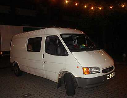 hier in München aufbauen - sofern der Tourbus, ein alter Ford Transit,