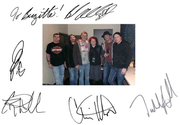 Dann haben wir noch unser Gruppenfoto mit der Band gemacht. Ich war gleich als zweites dran und hab danach sofort mein Foto ausgedruckt (dafür hatte ich ja extra meinen Fotodrucker eingepackt). Brad hat geschmunzelt, und von den organisierten Deutschen gesprochen, vorbereitetes Papier zum Unterschreiben mit Foto aufkleben und Fotodrucker