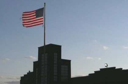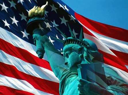 spielen. Mit der USA-Fahne im Hintergrund und Papierschnipsel von der