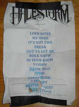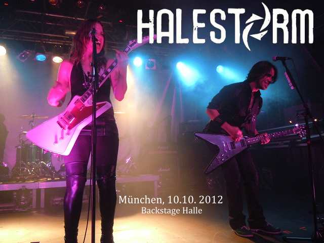 Als Franke und Fast-Nürnberger hat man es nicht leicht. Nicht nur wegen der derzeitigen Verfassung des „Glubb“ in der Fussball-Bundesliga, auch rocktechnisch läuft für Fans traditionellerer Mucke im Frankenland derzeit sehr wenig, so dass man doch immer bzw. immer öfter in die verbotene Stadt im Süden fahren muss. So war das auch diesmal der Fall zum Stelldichein von Halestorm im Münchner Backstage-Club. Für die 3 Jungs und das eine Mädel aus den US of A war es die erste Headlinertour durch good ol‘ Europe und das bereits nach zwei CD’s. Ziemlich rasant, sag ich mal aber auch wohlverdient, ist die sympathische Truppe doch meines Erachtens eine der wenigen „neueren“ Bands, die das Zeug zum ganz großen Durchbruch haben mit ihrer Mischung aus modernem und gleichzeitig melodischem Rock. Als Schmankerl hab ich mir zusätzlich das Meet and Greet gegönnt, welches inklusive Ticket auf ganze 46 Euro kam, eine Summe, über die Kiss nur lachen können, rufen diese für derartige Veranstaltungen vierstellige Summen auf. Für den Preis gab es dann neben einem Treffen noch einen hochwertigen Poster und einen Laminat-Pass. Aber von Anfang an: bei schlimmstem Wetter angekommen ging es bereits um 18 Uhr zum Backstage, Treffpunkt für die „Mieter und Grieter“ war schon um 18:15 Uhr vor der Halle. Es warteten bereits einige Leute vor dem Eingang, von denen ich erst dachte sie wären alle mit einem Ticket-upgrade ausgestattet, letztlich waren dies aber nur ganze 4 Leutchen sowie zwei, die das Meet’n Greet bei einem Preisausschreiben gewonnen hatten. Dabei war ein fränkischer Mitbürger, der bereits eines der oben beschriebenen Kiss-Meetings zu horrenden Preisen mitgemacht hatte, und man kam gleich ins Gespräch. Rock’n Roll verbindet eben immer. Nachdem die resolute Backstagemanagerin(die später auch T-Shirts am Merchandisestand verkaufte) die Namen kontrolliert hatte, ging es über ein paar Wendeltreppen in die heiligen Gemächer der Band. Am sehr lecker aussehenden Catering vorbei und schon stand man im eher spartanischen Backstageraum des Backstage. Blickfang der Truppe und sicher auch der Hauptgrund für ihren derzeitigen Erfolg war Bandleaderin Lzzy (richtig geschrieben!) Hale, von der ich an sich dachte, sie wäre auch offstage eine wilde Rock-Sau. Aber da war eher das Gegenteil der Fall, was nun aber ganz und gar nicht negativ gemeint ist. Sie war total sympathisch und machte eher einen etwas schüchternen Eindruck. Just am Tag des Auftritts in Munich hatte sie zudem Geburtstag. Der schlaue Franke wusste das natürlich, und so bekam sie von mir eine Packung Nürnberger Lebkuchen (mit der Bitte demnächst als Headliner in Nürnberg zu spielen) und von meinem fränkischen Kollegen einen Motörhead-Wein. Als Danke gabs eine leckere Umarmung und ein bisschen Smalltalk über die Tour und dies und das.