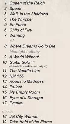 Nicht so toll war die viel zu kurze Spielzeit (90 Minuten). Da wurde natürlich so mancher Song nicht gespielt, den man gerne gehört hätte. Bei dem Backkatalog (ca. 20 Alben) und dem hohen Eintrittspreis doch ein wenig mickrig. T-Shirts ab 25 Euro waren mir auch zu teuer (20 Euro finde ich noch akzeptabel). Insgesamt war es ein sicherlich gutes Konzert. Aber es gehört nicht zu meinen Top 3 dieses Jahr.es Das sind bisher Toto auf der Loreley, Dan Reed Network und Meat Loaf (wegen der besonderen Atmosphäre/Abschiedsstimmung. Aber gelohnt hatte sich der Besuch in Langen allemal. http://www.queensrycheofficial.com/ Photos & Text: Bodo Fink |