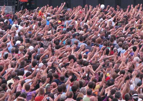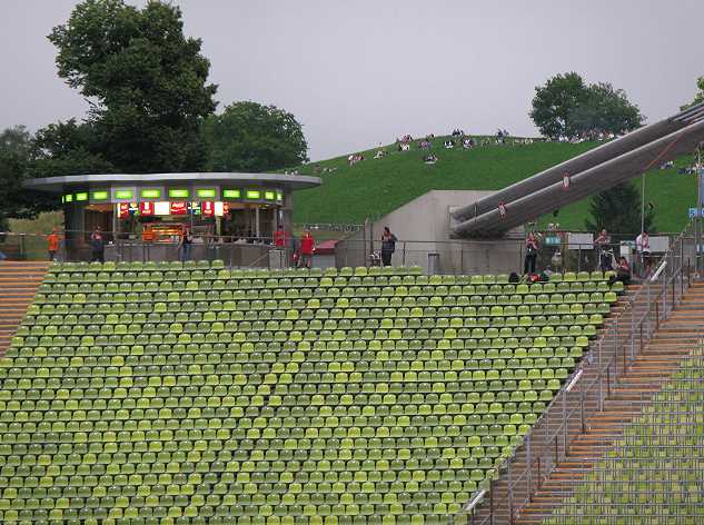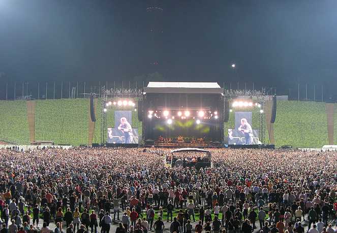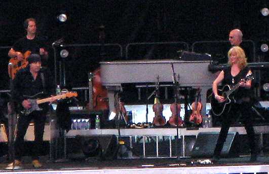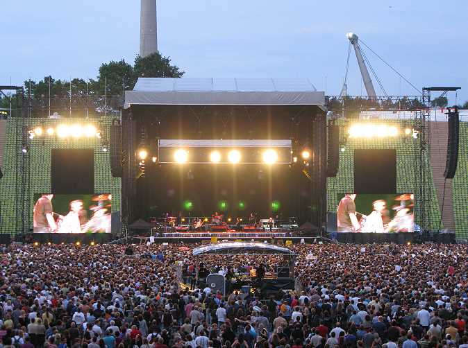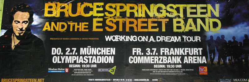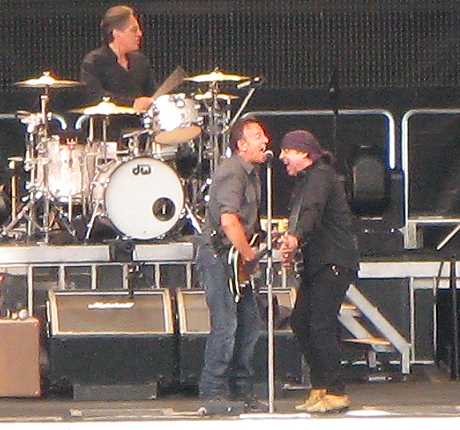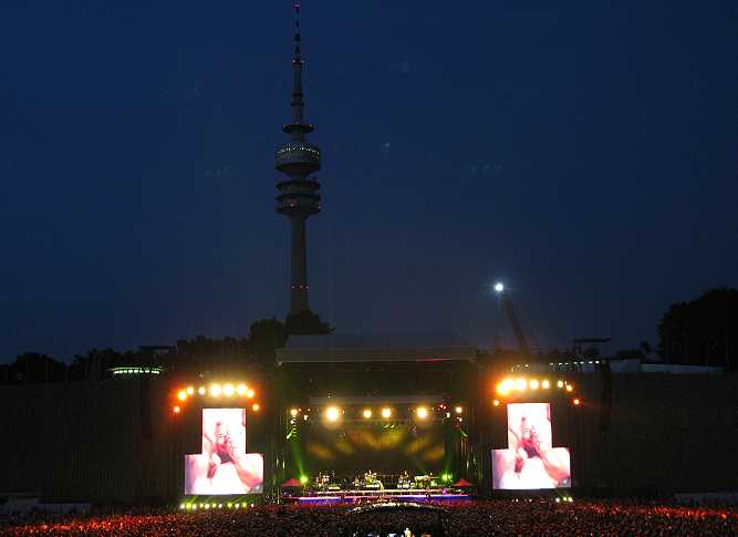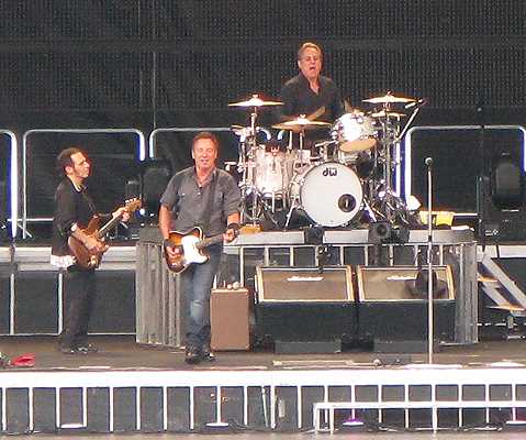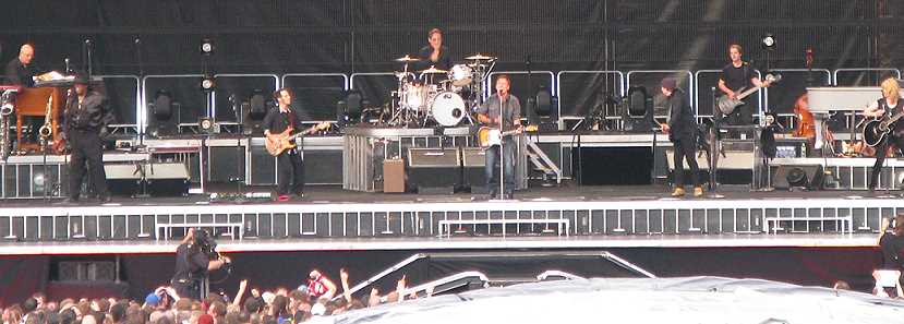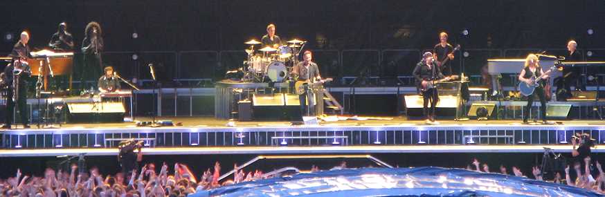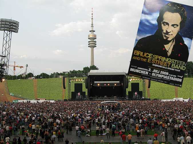 von Ursula: Auf meiner Fahrt nach München wurde ich immer wieder von heftigen Gewitterschauern begleitet.- Tempo 40 auf der Autobahn. Toll - und ich fahr zum Open Air… In München waren zwar immer noch Gewitterwolken am Himmel, grummeln tut’s auch noch zeitweise, aber es bleibt trocken und die Sonne blinzelt noch mal ins Olympia Stadion.Einen guten Platz hatten wir auch, ziemlich mittig, links neben der Technik, nach dem zweiten Wellenbrecher. Next time muß ich weiter vor !!! Um 20.15 Uhr gings los. Des Intro von Nils Lofgren „ Muß i denn zum Städtele hinaus“ hätte ich jetzt nicht gebraucht, aber es war halt ein Gag. Die Band kommt auf die Bühne. Bruce begrüßt uns mit guten Abend Munchen, auf geht’s ! Und legt one, two, three, four sofort mit Badlands los, schon kann ich hüpfen und mitgrölen was des Zeug hält.oh ho ho, ho ho Vorband, was is ne Vorband ? So was braucht Herr Springsteen nicht. Der Mann hat eine Ausstrahlung..schaut für sein Alter unverschämt gut aus..übrigens auch mit Hut ( bei outlaw Pete ) und bewegen kann der sich..ich sage nur ,Turnereien am Mikroständer bei Tenth Ave. Freeze-out. Ich wüsste gerne wo der Mann seine Power hernimmt ( liegt es am Viagra ? ) Er flitzt über die Bühne wie ein Junger. An diesem Abend war er super gut drauf, albern, für jeden Gag zu haben, ich lach' mich jetzt noch weg wenn ich an die Pretty Woman Aktion denke. Oder