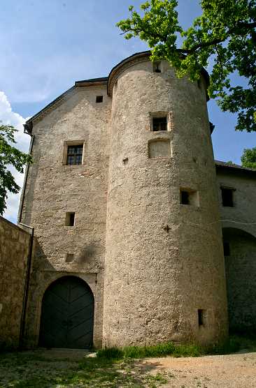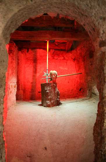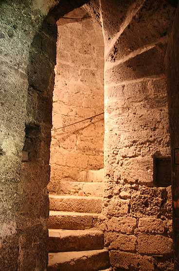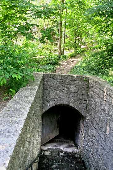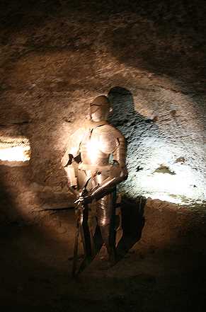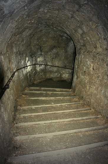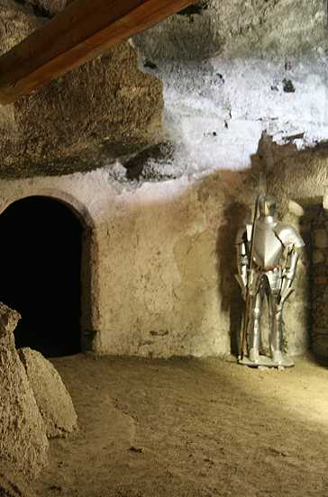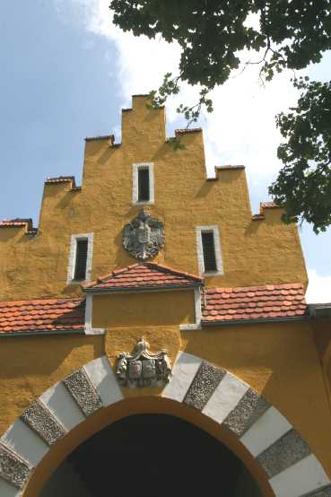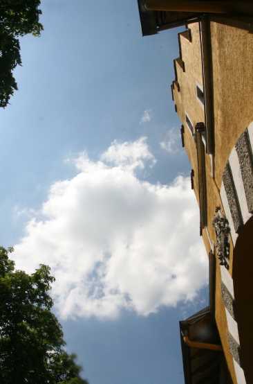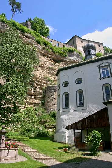 Deutschland. First by getting closer, the visitor realises, that this is not only one, but three castles. It's the so called Hochschloss (Highcastle), which is built on this special kind of Rock, we call Nagelflu and that one drops down aprox. 150 feet. A little below the Hochschloss, the Cave-Castle clues on to the rock. And the actual castle is at the bottom of this rock and is used as a college nowadays. - But the attraction is the Cave Castle, which is the biggest in it's kind in Germany |