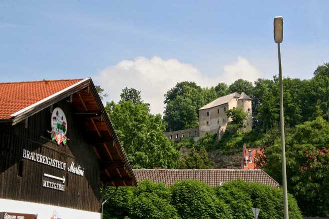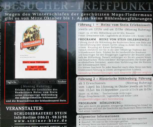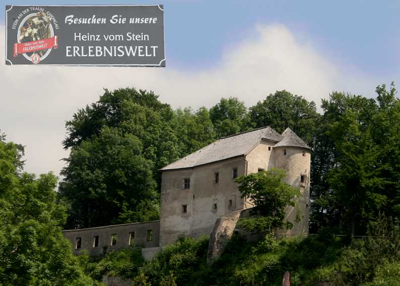 Die Ursprünge des Hochschlosses sind nicht vollständig geklärt, möglicherweise stammt es bereits aus römischer oder keltischer Zeit. Stein wurde im Jahr 1135 erstmals urkundlich erwähnt. Mit der Burg verbunden ist die Gestalt des legendenhaften Raubritters "Hainz von Stein dem Wilden", der Anfang des 13. Jahrhunderts in der Burg gelebt haben soll und zum ersten Mal von Lorenz Huebner 1783 in einem "vaterländischen Trauerspiel" beschrieben wurde. Die Burg selbst war seit dem 13. Jahrhundert bis 1633 im Besitz der Familie Toerring. Albert von Toerring-Stein war von 1613 bis 1649 Bischof von Regensburg, Adam Lorenz von Toerring-Stein bekleidete das selbe Amt von 1663 bis 1666. Graf Carl Fugger von Kirchberg erwarb 1633 den Besitz von den Toerrings, später kamen durch Einheirat die Freiherren von Lösch in den Besitz des Schlosses. 1818 entstand aus der früheren Hofmark im Zuge der Reformen in Bayern ein Patrimonialgericht II. Klasse. 1845 kaufte Amélie de Beauharnais, Witwe des Kaisers von Brasilien, Schloss Stein für sich und ihre Tochter. 1848 trat sie das Gericht Stein gegen eine Entschädigung an den Staat ab. 1890 kam das Schloss Stein an den Grafen Joseph zu Arco-Zinneberg. 1928 mussten die Arco-Zinneberg den großen St.-Georgi–Forst schlagen, um mit dem Holzverkauf Schulden zu tilgen. Sie mussten trotzdem verkaufen, der Wald ging in Staatsbesitz über und wurde sofort wieder aufgeforstet. Hochschloss, Felsenburg und Unterschloss sind heute im Besitz der 1907 neu erbauten Schlossbrauerei Stein, die wiederum seit 1934 im Besitz der Familie Wiskott ist. Das Unterschloss in Stein beherbergt seit 1948 ein Internat, die Schule Schloss Stein. The roots of the High Castle are not clear, but probably have started out in the roman or celtic times. Stein was mentioned first time in 1135. The Cave Castle is connected to the figure of the legend of robber baron Heinz from Stein, the wild one, who is supposed to have lived at the castle in the 13.Century. He was mentioned first time in a theater play by Lorenz Heubner iin 1783. The castle itselves was owned by the family Toerring from the late 13.Century until 1633. Albert of Torring-Stein was the bishop in Regensburg from 1613 - 1649. Adam Lorenz of Toerring-Stein continued the same job from 1663 - 1666. Earl Carl Fugger of Krichberg bought the castle from the Toerriings in 1633. Later on the Family of Lösch got the castle because of marriage. In 1845 Amelie de Beauharnais, widow of the emporer of Brazil bought the castle for her daughter. In 1848 she had to give back the castle to the country. In 1890 the earl Joseph to Arco-Zinnberg became the next owner. In 1928 this family had to sell it again to pay their dephts. Nowadays the all 3 castles are owned by the local brewery of Stein, which is again owned by the family Wiskott. |
