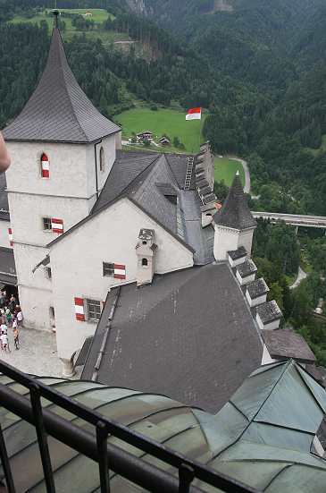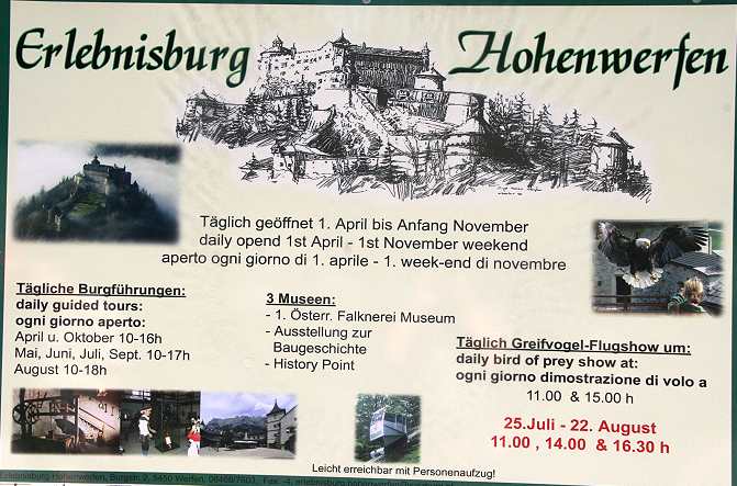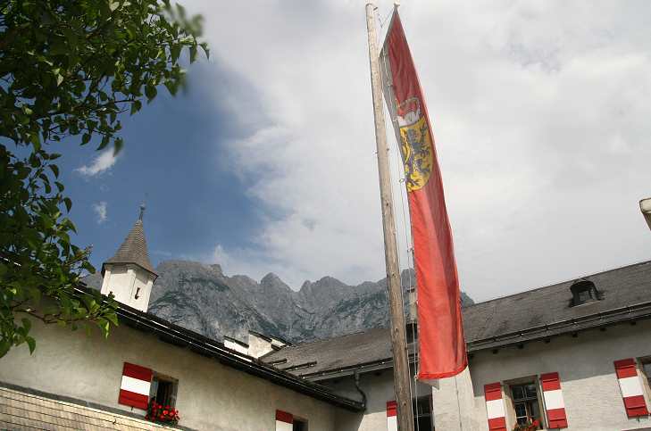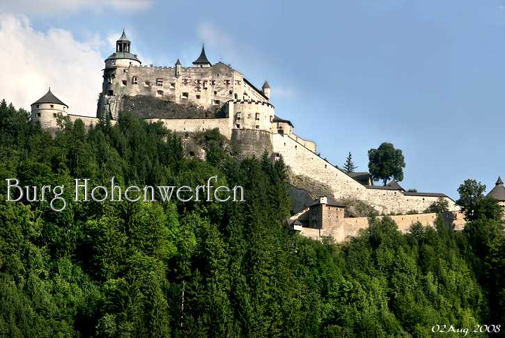 Die Burg Hohenwerfen auf dem 155 m hohen Felskegel hat eine wechselvolle Geschichte - geprägt von Zerstörungen und Wiederaufbauten - hinter sich. Sie wurde 1077 erbaut und nach 1122 zur Hauptfestung ausgestaltet, 1526 teilweise von aufständischen Bauern zerstört, 1530-85 ausgebaut. Ab 1898 restaurierte Erzherzog Eugen die im 19. Jahrhundert verfallene Burg. Leider wurde sie 1931 durch Großbrand teilweise wieder zerstört. Zum Glück konnte sie erneut restauriert werden. Heute befindet sich in der Burg ein Museum und eine Greifvogelwarte. The fortress Hohenwerfen on a 600 feet high rock has a very lively history, dominated by destroyal and rebuilding. It was first built in 1122. In 1526 it was partly destroyed by revolting farmers, but in 1530 - 1585 rebuild and even further built. IN 1898 the duke Eugen renewed the castle again, which became a ruine in the 19th century. Unfortunately in 1931 it was once again almost destroyed by a huge fire. Again rebuilt it is nowadays a museum and home for many falcons . |