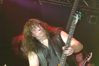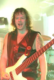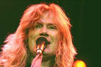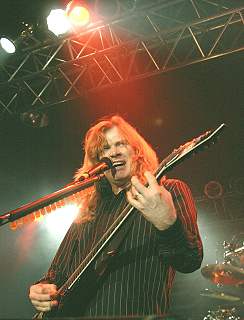 Also eines muss man Dave Mustaine bei allen Sympathie-Defiziten lassen. Professionell ist er in jeder Beziehung. Ob das Pünktlichkeit ist, die übertriebenen Sicherheitsvorkehrungen oder Superstargebaren, das uns Fotografen, statt nach den üblichen drei ersten Songs, bereits nach zwei Gassenhauern aus dem Graben befördert, um anschließend unter Security-Aufsicht unser Werkzeug an der Garderobe abgeben zu müssen. Unsere gute alte Elserhütte scheint langsam das Flair von Olympiahallen-Niveau zu erhalten. Da kommt Freude auf. Aber zurück zum Geschehen, das erstmal um, wie schon erwähnt, Punkt Acht, den Support „Diamond Head“ auf die Bretter schickt. Okay, ich gebe ja zu, dass ich des öfteren die Anheizer unserer Rock’n’Roll Lieblinge etwas vernachlässige in meinen Reviews. Aber dieser ist es allemal wert erwähnt zu werden, schon allein wegen der Tatsache, dass meine erste Reaktion war: „waaaasss, - die gibt es immer noch?!!!“ – Und so ist es wirklich und leibhaftig. Allerdings verwette ich meine geliebte Kamera, dass 99% aller Fans weder wissen, dass es diese Formation bereits in den Achtzigern gegeben hat, noch dass eigentlich nur mehr der Gitarrist vom Original Line-up übrig ist. Geschweige denn, dass die Kids irgendwelches Songmaterial von früher kennen. – Und last but not least passt diese Gruppe musikalisch so gut zu Megadeth wie Journey zu Slayer. Meine Hochachtung, sie werden trotz allem von den zahlreichen Megadeth Fans äußerst frenetisch angenommen und auch abgefeiert. Diamond Head werden nach wie vor in die sogenannte Melodic Rock Ecke eingeordnet. Und mit sehr viel Melodie beginnen sie auch ihr Set. Allerdings werden sie im Laufe ihrer genau abgesteckten Time Schedule in Speedgeschwindigkeit immer härter. Und ganz zum Schluss hat sich der Support fast an den Headliner angepasst, was Härte und Metal angeht. Tja, so muss es denn wohl sein. |