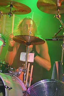 auch noch mit schwungvoller Lockerheit auf die anwesenden Headbanger übertragen.