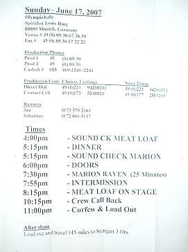 die Dressing Rooms seine eigene Toursecurity und wir durften da nicht hin.Er wollte auch keine Ordner direkt vor der Bühne, nur daneben. Er hatte hinter der Bühne noch mal einen eigenen abgetrennten Bereich, wo er2x ne Sauerstoffdusche nahm. Dort hatte man auch ein Inhaliergerät etc. Seine zwei Backgroundsängerinnen hatten eine eigene Umkleidekabine álà Aerosmith, die nach dem Konzert noch eine besondere Bedeutung bekommen sollte. Während des Konzertes musste er schon einmal ans Inhaliergerät und an die Sauerstoffdusche und dann auch noch vor der Zugabe. Aber das Konzertende war "strange". Die Zugaben waren beendet und die US-Toursecurity sicherte den gesamten Zugang von der Bühne zur Garderobe, und wir sollten uns sozusagen "unsichtbar machen". Es kamen die Musiker und die beiden Sängerinnen, nur kein Meatloaf. Wir warteten 3-4 Minuten und er kam nicht? Ich stand am Gang zum Produktionoffice und plötzlich wurde das große hintere Bühnenstahltor geöffnet und jemand setzte die Roadies in Bewegung und ein Stapler fuhr Richtung Bühne. Die Toursecurities waren sichtlich irritiert. |