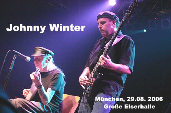hingelegt hat. Jawohl, da is’ er nun endlich. Drei lange Jahre hat es gedauert ihn hier her zu bekommen. Drei Jahre während derer wir nie sicher waren, ob er noch lebt oder schon das Zeitliche gesegnet hat. – Hat er aber nicht. Johnny Winter wirkt zerbrechlich, dank seiner Dürre, den Zigaretten-Armen und einer Blässe, die dem Gespenst von Canterville alle Ehre macht. - Er sieht mit 62 eher aus wie 85, ohne Übertreibung. Und er sitzt während des gesamten Auftritts, denn genauso wie die Erscheinung hat auch das Stehvermögen über die Jahre hin gelitten. Und noch etwas ist mir vehement aufgefallen. Ich habe in all den Jahren, in denen ich Konzerte besuche, noch nie einen Musiker erlebt, der vom ersten Ton bis zum letzten, die Augen geschlossen hält. Ich vermute mal schwer, dass auch das Sehvermögen mehr dem einer Blindschleiche gleicht.