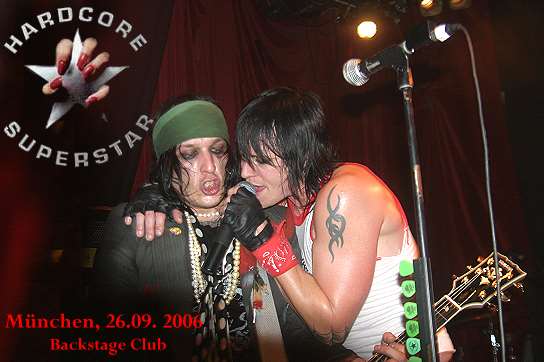 - Und ich frage mich schon seit mindesten vier Jahren, warum diese Combo nicht bereits den selben Status wie ihre Landsmänner ‚Backyard Babies’ inne hat. Denn ich möchte mal ohne Übertreibung behaupten, dass unsere Perlenketten behängten, und Faltenrock tragenden Sleaze – Punkrock – Nordlichter noch um Längen impulsiver und besser sind als sämtliche Backyard-Hellacopter –verqueren Babies zusammen.. Ganze vier Mal hatte ich bislang das Vergnügen die selbsternannten Superstars live bei ihrem Hulatanz zu erleben. Und jedes Mal war’s ein Tanz auf dem Popokatapetl, - Feuerzauber inbegriffen. – Ein Garantieschein für einen Höllentrip, sowohl on stage als auch off stage im Publikum, dass aus ebenso verrückten Paradiesvögeln besteht wie die, die da oben rumgackern. Aber gleich und gleich gesellt sich bekanntlich gern. Nein, im Ernst, Hardcore Superstar verstehen es, mitreißenden Rock’n’Roll mit schweißtreibenden Bewegungsabläufen zu kombinieren, die fast die Schallmauer durchbrechen, versehen mit der veramerikanisierten optischen Exotik, von schrägem nordischen Charme. - Capito?