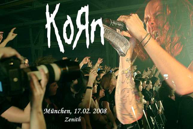 Ich kann mich noch gut erinnern, als ich Korn das erste Mal live on Stage gesehen habe. Das war vor ca. 13 Jahren im alten Backstage hier in München vor 200 Fans. Und es liegt eine halbe Ewigkeit zwischen jenem Event und dem heutigen Abend. Der Unterschied zu damals sind schlicht und ergreifend 4.800 Fans mehr und ein Repertoire von 10 Alben inkl. Best of’s... und Unplugged und der aktuellen Scheibe ‚Untitled’, sowie unzähligen Soundtrack-Beiträgen, Singles und Videoclips. Korn werden übrigens auch gern als die Begründer des sogenannten Nu Metal bezeichnet. Aber ehrlich gestanden, sehe ich keinen gravierenden Unterschied bei so einer postmodernen Beschreibung zum herkömmlichen Heavy Metal. Deshalb lassen wir lieber dieses Schubladendenken und das kleinkarierte auseinander fitzeln von Pseudo-Nischen. Fest steht, dass sich dieses Quartet einer ständig wachsenden Beliebtheit erfreut. Waren sie anfangs nur ein Insidertipp hierzulande, so gehören sie jetzt fast schon zur festen Institution im deutschen Metal-Basiswissen. Nun denn, unser ungeliebtes Zenith ist rammelvoll. Und soll sich einer noch mal über zu hohe Ticketpreise oder Rauchverbot beschweren. Wer seine Heroes unbedingt sehen will, der nimmt auch diese Unannehmlichkeiten in Kauf. Und fast schon passend dazu nennt sich diese Tour: "Bitch We Got A Problem - Tour 2008"