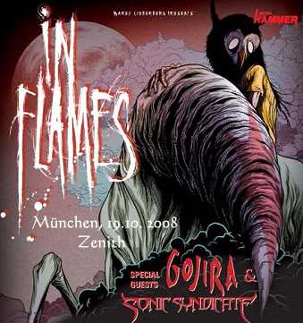 InFlames... .... sind wieder einmal zu Gast hier in München, allerdings diesmal ohne Feuerzauber und Pomp und Glamour, was wahrscheinlich wieder einmal unseren Münchner Stadträten zuzuschreiben ist, die auf ihren strengen Sicherheitsregelarien bestehen. Aber da ist man machtlos und fügt sich der Willkür. Angeführt wird das Flagschiff von gleich zwei Supportbands, die ich aber, und bitte verzeiht mir das jetzt, - beide glorreich versäumt habe. Zum einen wäre das Gojira die den Opener machen, und Sonic Syndicate, die den Funken noch um ein weiteres anschüren sollen. Was ich nicht verstehe, ist der Umstand, dass die halbe Halle durch den üblichen schwarzen Vorhang abgehängt ist, sich aber in der anderen, vorderen Hälfte die Fans fast tot drücken nach vorne hin, trotz eingefügtem Wellenbrecher. Wesentlich bequemer wäre es gewesen, wenn der komplette Raum offen gewesen wäre. Die Gründe für die örtlichen Verhältnisse entziehen sich leider meiner Kenntnisse. Anyway, In Flames gehören zu jener Gattung von – New Generation Metal Bands, denen vor allem ein junges Klientel frönt. Andererseits sind die Schweden nun doch schon seit 18 Jahren unterwegs und haben ganze 9 Alben und eine DVD auf den Markt geworfen. Und mit dieser Tour jetzt wird das neunte Teil ‚A Sense Of Purpose’ promotet. Nun denn, immerhin zählen wir hier ca. 3.500 jugendliche Verfechter des sogenannten Melodic Death Metal, - oder wie auch immer man diesen Stil einordnen möge. Aber richtig zu Ruhmesehren ist die Band erst in den letzten vier oder fünf Jahren gekommen. Nämlich dann, als die junge Generation von Heavy Metal Fans die Truppe für sich entdeckte. Angeführt werden In Flames von Sänger Anders Fri´den, der mit seinen imposanten Dreadlocks den visuellen Stil der Band dominiert.