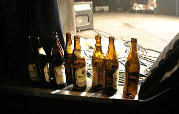 Evian-Plastikflasche, während wir hier unten im Publikum ein Paulaner Hell