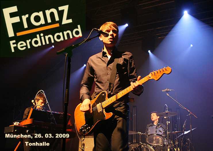 Okdiok, beginnen wir das Ganze mal so... Wie würdet Ihr Euch einen Menschen vorstellen, der Friedrich Wilhelm, oder Karl Friedrich, oder eben Franz Ferdinand heißt? – Genau! So kann nur ein adretter Abiturient oder Buchhalter aussehen, - geschniegelt, mit, bis oben hin zugeknöpften, Hemd, und akurater Kurzhaarfrisur, Krawatte miteinbegriffen, aber nicht unbedingtes Muss. - Und genauso sehen unsere Franz Ferdinand aus, wenn sie hier in der Münchner Tonhalle die Bretter betreten, quasi der Traum aller Schwiegermütter... – bis.. sie loslegen. Und spätestens dann würde Omi schnurstracks die Flucht ergreifen. Denn die Schotten lassen das Gespenst von Canterville buchstäblich Rock’n’Roll tanzen. Heissa, da verflüchtigt sich sogar der berühmt-berüchtigte Highland Nebel von der Bühne im Sauseschritt und bringt die Puppen im Publikum buchstäblich zum tanzen. Die Tonhalle ist mit ca. 2.000 Fans absolut ausverkauft. Ich glaube, nicht mal eine platte Flunder hätte da noch Platz gefunden. Aber... und das ist der springende Punkt... Es sind nicht nur, wie üblich, die ersten 20 Reihen, die vor Enthusiasmus durchdrehen, sondern von der vordersten Front bis zum allerletzten Schottenrock ganz hinten tobt der Klabautermann. Ehrlich gestanden, habe ich selten so einen Enthusiasmus bei all den 20 – 35 Jährigen erlebt, wie heute bei der Hab Acht Stellung von Franz Ferdinand. Support kam übrigens von Kissogram. Aber von denen habe ich leider nicht allzu viel mitbekommen. Well,.... und damit umgehend zur Schotteninvasion, und die besteht aus Alex Kapranos (Gesang/Git), Nicholas McCarthy (Git,Keyb.Voc), Paul Thomson (Drums) und Robert Hardy (Bass). Den Bandnamen haben sich die Vier vom österreichisch-ungarischen Erzherzog Franz Ferdinand geliehen, dessen Ermordung 1914 in Sarajevo den ersten Weltkrieg auslöste. Übrigens, die Band besteht darauf, dass der Name auch deutsch ausgesprochen wird. Drei Alben, zwei DVDs und etliche Singleauskoppelungen hat man im Rucksack. Und gute Chartplatzierungen, sowie Brit.Music Awards Auszeichnungen, haben das ihrige getan, um die Band auf eine international hohe Basis zu bringen. Der deutsche Einfluss in der Band geht vom Gitarristen Nick McCarthy aus, der im oberbayrischen Bad Aibling das Gymnasium besuchte und in München Klavier und Kontrabass studierte. Er spielte in seiner Zeit in München bei der Folk-Punk Band Kamerakino und beinahe fünf Jahre bei dem Krautrock-Musiker-Kollektiv Embryo. Somit ist dieser Gig hier quasi ein Heimspiel für ihn. Er ist es auch, der die meisten Ansagen zwischen den Stücken übernimmt, natürlich in deutsch.