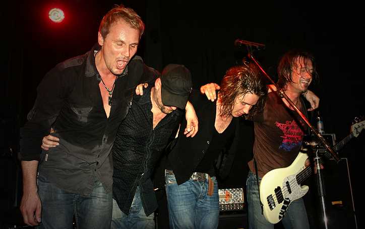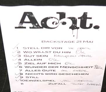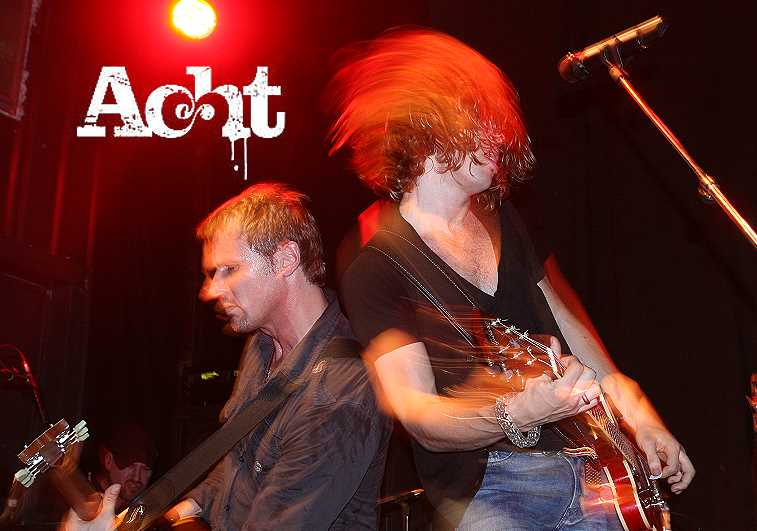 Der Zauber beginnt sehr explosiv mit der Nummer ‚Stell Dir Vor’. Hierbei handelt es sich um ein Stück, das einen zu überzeugen vermag, dass sich die deutsche Sprache sehr wohl für Rockmusik eignet. Denn dass so etwas nicht immer der Fall ist, wissen wir aus der Vergangenheit aus anderen Fällen zur Genüge. Deshalb auch hier Respekt, dass man sich bei ‚Acht’ der üblichen englischen Norm widersetzt, auch auf die eventuelle Gefahr hin, dass man nicht sehr weit über germanische Grenzen gelangen wird. Herr Oswin gilt nicht zu Unrecht als erstklassiger Gitarrist der Münchner Szene, was das eine oder andere Solo zwischendurch beweist. Allerdings macht er auf mich wiederum eher den Eindruck eines Kleinmist-Tüftlers, bei dem auch der winzigste Floh korrekt im Mittelohr sitzen muss, wenn Ihr versteht was ich meine. Gil Ofarim hat die Mädels... äh sorry... das kleine aber elitäre Publikum sofort um seinen kleinen Fingernagel gewickelt. Und ich habe den Eindruck, dass ihn diese Gegenliebe in seiner Selbstsicherheit deutlich anspornt im Verlauf dieses Live Debüts. Das Resultat ist letztendlich dann ein Bad in der Menge, um damit eine, wirklich impulsive, und im wahrsten Sinn des Wortes, kochend heiße, Einlage zu beenden. Mein persönliches Fazit: „für’s erste Mal hat der Orgasmus schon ein paar kleine Wellen ausgelöst. Jetzt müsste er nur noch etwas intensiviert und vor allem vervielfältigt werden. Dann simma’ happy...... Daddy Abis Stolz hat er ohnehin schon längst provoziert....