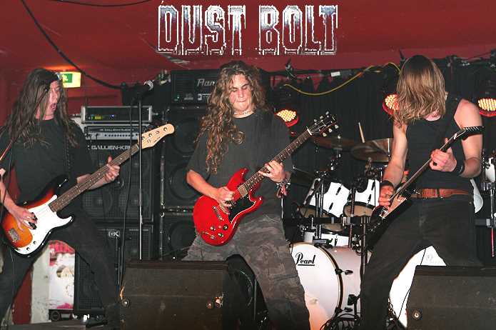 promoten gilt. Kinder helft mir, denn ich bin mit meiner Weisheit am Ende, woran es gelegen hat, dass hier im Cafe Paradox in Ingolstadt nur ca. 30 vergammelte Seelen aufgetaucht sind zu diesem Stell Dich Ein. Vielleicht ist es der Ort, der nicht zur Band passt, vielleicht ist es die Band, die nicht mit dem Tag harmoniert oder die Stilistik, die nicht die Stimmung zu einem Konzertbesuch provoziert. Tatsache ist ebenfalls, dass Zak Stevens auch keine alten Savatage Fans aus den Hauspantoffeln wecken konnte in dieser Stadt. Und die glorreichen Zeiten von Begleitband Vicious Rumors haben sich, um ehrlich zu sein, bereits mit dem Ableben von Sänger Carl Albert 1993, verabschiedet. Armer Geoff Thorpe! Wie sehr kämpft er seitdem um weitere Anerkennung und wechselt seine Frontmänner durch wie andere ihr tägliches T-Shirt. Aber an den guten Carl, Gott hab ihn selig, ist bislang keiner heran gekommen, weniger was die individuellen Talente angeht, sondern vielmehr ist es dieser ganze spezielle Gesangsstil von Carl, der bislang von keinem anderen auch nur annähernd erreicht wurde. Aber ein Geoff Thorpe gibt nie auf. Und vielleicht findet das, ach so gerupfte Federvieh irgendwann doch wieder ein kleines Korn im überdimensionalen Suppentopf der Industrie. Zu wünschen wäre es ihm. Vorletzte Truppe sind Steel Engraved aus Passau, von denen ich, ehrlich gestanden, vorher noch nicht viel gehört habe, dafür aber umso mehr vom Opener Dustbolt, ebenfalls aus Bayern und zugleich die Kücken im Verein. Diese Jungs sind unsere persönlichen Schützlinge hier in München, den mit ihren, gerade mal durchschnittlichen 20 Jahren legen sie eine Motivation an den Tag, dass es stets eine Gaudi ist, ihnen beim musizieren zuzusehen. Und genau aus diesem Grund sind sie immer wieder gern gesehene Gäste als Supportacts anderer namhafter Rockbands in München und Umgebung. Es gibt mehrere Gründe warum ich zum heutigen Konzert den Weg nach Ingolstadt auf mich genommen habe. Aber hauptsächlich will ich einen alten Freund wieder treffen, einen, der mir in den letzten 25 Jahren ans Herz gewachsen ist und mit dem ich so manche Erinnerung teile. Und jedes Mal wenn sich dazu die Gelegenheit bietet, nehme ich sie auch wahr, denn, so denke ich mir, wer weiß wann und ob es ein nächstes Mal gibt. Aber dazu später. Erstmal sind Dustbolt dran, die leider vor fast leerer Hütte auftreten müssen.