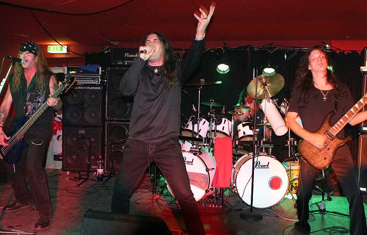 Auf alle Fälle drehen Vicious Rumors 2010 hier und heute Abend auf, also ob der Jüngste Tag angebrochen ist. Beim heiligen St.Christopherus, da wackelt der letzte Backenzahn in seiner Verankerung, vor allem was die enorme Lautstärke betrifft. It’s Showtime im wahrhaftigsten Sinn der gesprochenen, bzw. gesungenen Silbe. Und das Hauptinteresse liegt selbstredend auf dem Sänger - Brian Allen, der ja bekanntlich schon einmal für kurze Zeit in dieser Firma angestellt war. Nun, mal abgesehen vom a-typischen visuellen Aspekt eines Heavy Metal Shouters, macht er seine Sache relativ gut. Ich betone hiermit das Wort ‚relativ’, denn, so hoffnungslos das jetzt klingt, aber an einen Carl Albert hat hinterher noch keiner auch nur annähernd heran gereicht. Und leider unterliegt diese Band nun mal dem Fluch, dass sich alles und jedes was die orale Beisteuerung betrifft, nun mal an der einstigen goldenen Kehle von Carl misst.