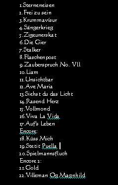 leider?) so lasst uns begnügen mit was wir erhalten die Meinung obgleich der Akustik ist leider gespalten Von Stunde zu Stunde gewartet wir hatten mit hoffender Seele und hohen Messlatten uns konnte der mutige Glauben die Freud’ an der Musik trotzdem nicht rauben. >>> (bei aller Fan-Liebe und zugedrücktem Augenzwinkern:-) Nun ist es aus, man kann nichts ändern mehr zu spät um noch den Level auszutauschen doch schön wars trotzdem dem zu lauschen >>> (für manche Mädels auch was zu schauen - siehe Fotos drunter) von – frei zu sein – bis unsichtbar Zigeunerskat wohl denn, ganz klar Genuss war’s trotzdem – ohne Reue so wohl denn hält jeder Euch fortan die Treue |