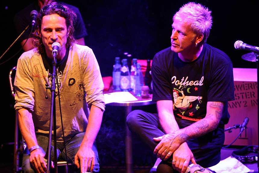 Der Verfasser des neuen Wälzers ist sogar extra aus Hamburg angereist und erreicht den Tatort hier gerade eben noch, bevor sich die Himmelsschleusen öffnen und der liebe Gott uns mit literweise Nass tauft, jedenfalls solange wir noch vor der Tür im Freien harren. Und letzteres geschieht auch nur, um das nonstop, unbefriedigte Verlangen einiger Genussspechte nach dem ultimativen Lungen- Orgasmus zu stillen. Für jenen braucht es zwar keine Verhütung, aber der Höhepunkt stellt sich dafür auch nie gänzlich ein, da es schon vorher erneut zu Entzugserscheinungen kommt. Das ist ein Teufelskreis fürwahr, auch wenn man sich als Nichtraucher nicht vorzustellen vermag, wie schwer es ist, mal eine halbe Stunde auf das ungesunde Vergnügen verzichten zu müssen. Nun, ein akustisches Odeuvre ala’ In Extremo muss ich Euch ja nicht weiter beschreiben. Denn das gab es ja in der Vergangenheit schon vielfach, aber dann doch auch immer wieder ein wenig anders. Dieses Mal läuft es ganz leger ab in blauer Levis-Neuzeit-Beinbekleidung und exotisch-paradoxem Pothead T-Shirt, ergo von Mittelalter Romantik keine Spur, - muss aber auch nicht sein. Halt das stimmt denn doch nicht ganz. Denn meine Hoffnung: heute mal ganz ohne, - äh, ich mein’ natürlich ohne Dudelsack – wird denn leider doch nicht erfüllt. Andererseits gehört die Sackpfeife zu In Extremo wie die Eiswürfel ins Wodkaglas gelle?! Und wer weiß das besser als eben In Extremo :-) Geschichten-Erzähler Wolf-Rüdiger gesellt sich nach dem anfänglichen, musikalischen Blumenstrauß zu seinem, in diesem Fall, physisch, präsenten Buch-Inhalt auf die Bühne, um uns eine Kostprobe aus den verfassten Anekdoten zu servieren.