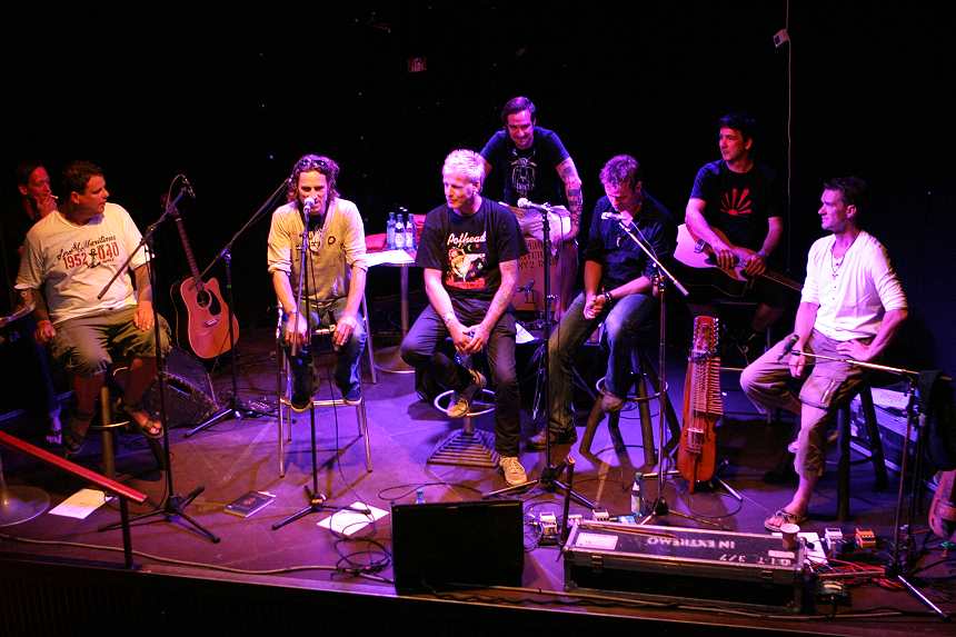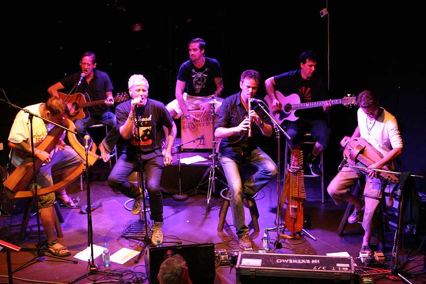 Wolf-Rüdiger liest weiter und einige weise Kommentare werden hinzugefügt. Lediglich dem Angebot von Micha & den Verweigerern in Sachen knieender Leibesübungen, etwaige Fragen der werten Zuhörerschaft beantworten zu wollen, wird nur träge nachgekommen. Dabei stellt sich die Frage, ob das eher an der scheuen Geziertheit der treuen Anhänger liegt oder vielmehr an der Tatsache, dass es (noch) nichts gibt, was unklar oder wissenswert ist, da der neue Wälzer erst noch gelesen werden muss, wie zum Beispiel von meiner selbst. Die Lesung ist beendet, Wolf-Rüdiger macht wieder Platz da oben und die sieben Geißl... äh Helden unserer Dudelsack Zunft hängen noch ein weiteres musikalisches Ständchen dran.