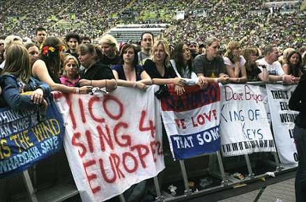 in the frontrow, showing messages for the bands. It starts to rain (fortunately