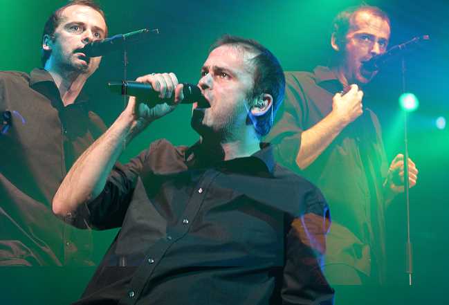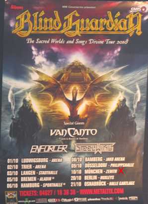 Eighties Band. On The other hand, this venue here can hold 7.000 until it's sold out. So you can imagine how empty the place seems despite the 2.000. Hoever, everything is relaxed and happy go lucky, no squeezing and squashing. Blind Guardian are here this time to promote their new album 'At The Edge Of Time' and to make us aware that they are still here and up to date. - Because it's been a few years, that singer Hansi Kürsch and Co. were here in Munich, Last time at The Tonhalle, a venue perfectly fitting for this band. But well, this time it's the Zenith, and they are going to make the best out of it. If one rockgroup has deserved the reputation to be with their feet on the ground, then it's surely Blind Guardian. Well, at least nowadays they leave the jogging pants in the cupboard. By getting older, the guys got a little more sophisticated. And that's not only because of the visual aspects. You can convince yourself after both supportacts here - Steelwing and Van Canto have played their stints.
