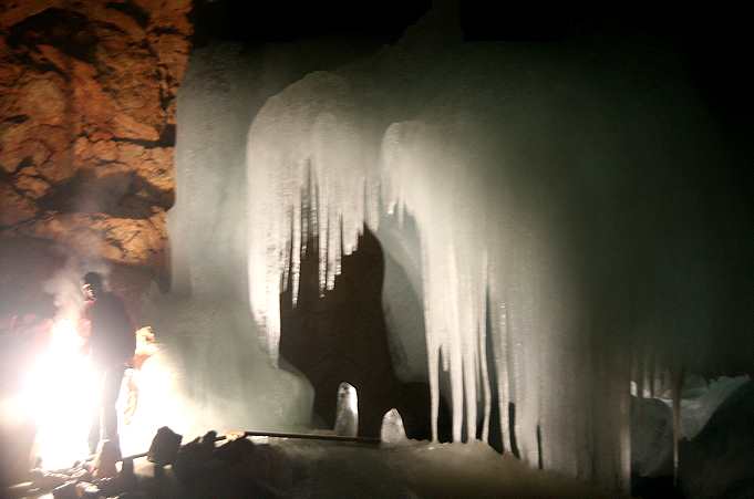Grubenlampen, die jeder 10te Besucher erhält, vorhanden zur Wegfindung. Only when the guide burns a magnesium light to view the ice beauties, it is maybe possible to shoot some pictures like these one's here. But, you need a good camera and you've got to be quick. Because such a magnesium light burns only for about 15 seconds, sometimes even less. Apart from that, there is only some candlelights there, hold by every 10th visitor for finding the way to walk. |