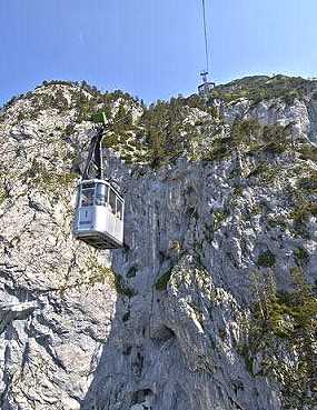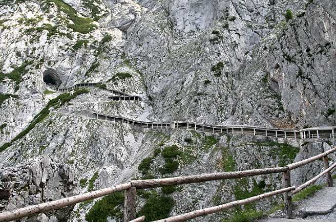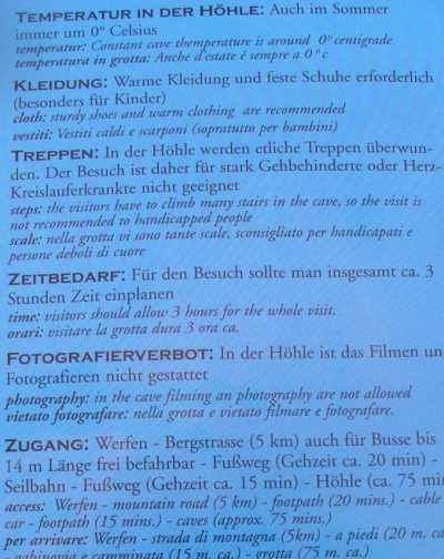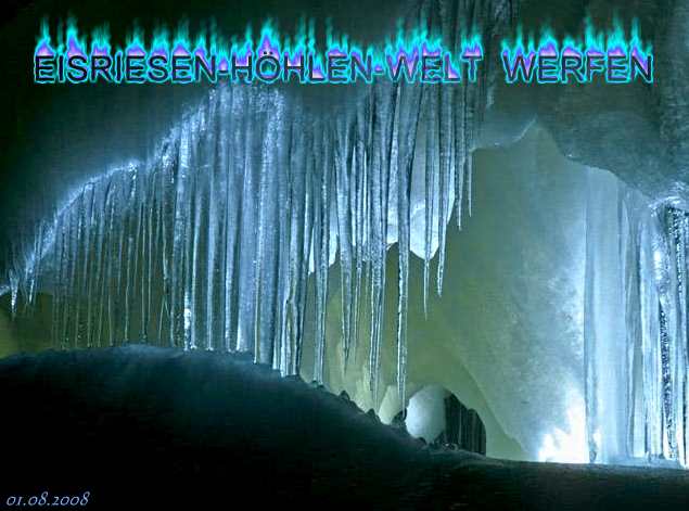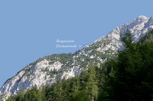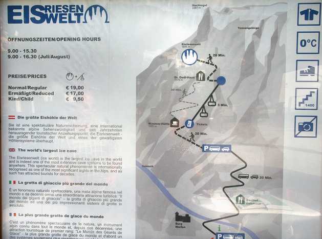 befahrbar. Nach etwa 20 Minuten gelangt man zu Fuß zur Talstation der Eisriesenwelt Seilbahn, die die Besucher in 3 Minuten über die fast senkrechten Abhänge des Tennengebirges zum Berggasthof Dr.-Oedl-Haus führt. Nach nochmaligem Fußmarsch von etwa 15 Minuten erreicht man das riesige Höhlenportal in 1.642 m Seehöhe. Hier empfängt der Höhlenführer die Besucher. In der Höhle werden zahlreiche Treppen (134 Höhenmeter) überwunden. The largest Ice Cave in the world is situated just south of the city of Salzburg, about 40 km on the A10 motorway. When you have reached Werfen, you drive up the mountain until you reach the parkingslots for cave visitors. From there you hike about 20 minutes up to the cable car station. The cable car takes you up the mountain within 3 minutes. Then you've got to walk another 20 minutes to the cave entrance to join one of the frequent guided tours through the cave. |