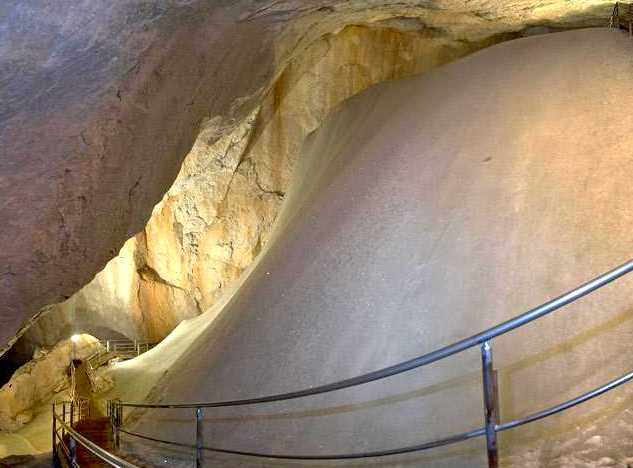 zu besichtigen. Der große Rest ist zwar komplett erforscht aber nicht begehbar. The Ice Cave is a cave system with a lenght of about 40 kilometers (25 miles). Only a small part is covered in ice and free for visits. Although the bigger part is completely explored, there is no passage for a common visit. |